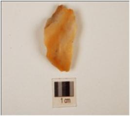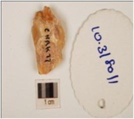 | Description / विवरण | A chert flake, side struck, unprepared platform, diffused bulb with ripple marks and plano convex cross section. |