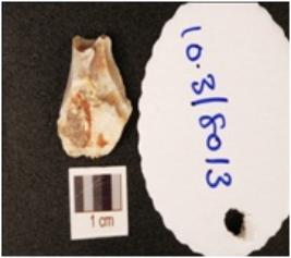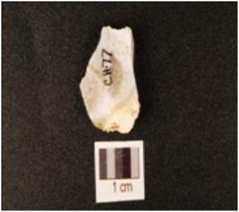 | Description / विवरण | A chert flake with a striking platform, positive bulb on ventral side, broken at other end, rectangular cross section and flake scars on surface. |