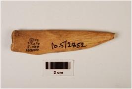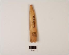| Description / विवरण | A point made on bone with natural shallow depression on one side, rectangular in cross section, polished surface and partly broken tip. |