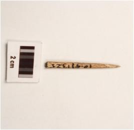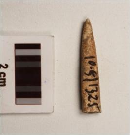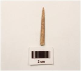 | Description / विवरण | A bone point, partly broken from one end and smooth surface. |