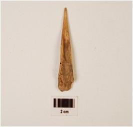 | Description / विवरण | Bone point with a pointed end, the top portion is porous, hollow surface of bone marrow visible on one side, polished surface. |