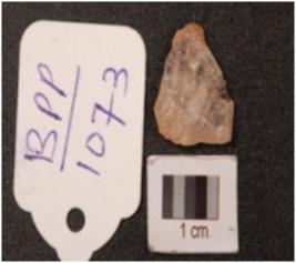 | Description / विवरण | Quartz small waste flake, triangular shaped, rugged surface, cortex on dorsal sides. |