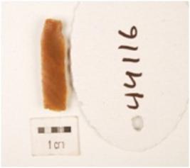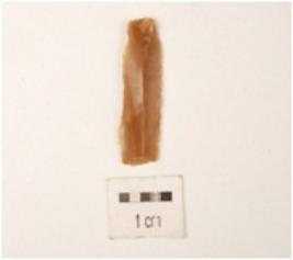 | Description / विवरण | Fragment of blade chert object, use wear marks, ridges on dorsal side surface, triangular section, platform and bulb difussed. |