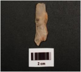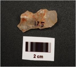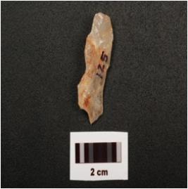 | Description / विवरण | Blade, made on quartz with a prominent ridge and flake scars on dorsal side, partly broken use wear marks on one cutting edge and triangular in section. |