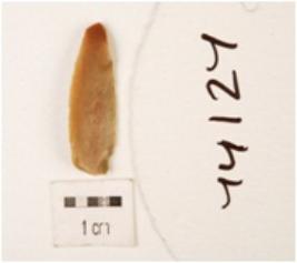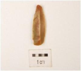 | Description / विवरण | Fragment of blade chert object, one ridge on dorsal side surface, triangular section, use wear marks, proximal end on bulb and prepared platform. |