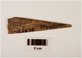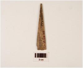 | Description / विवरण | A point made on bone with flat rectangular in cross section, polished surface and slightly tip broken. |