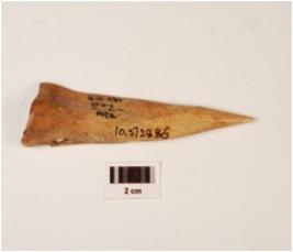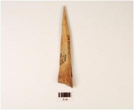 | Description / विवरण | A point made on bone with natural shallow depression on one side, plano-concave in cross section, polished surface and use-wear marks along the tip. |
