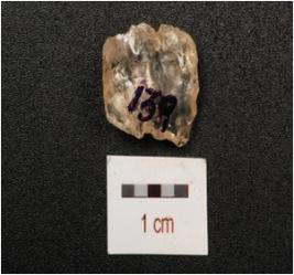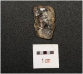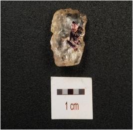 | Description / विवरण | Blade, made on crystal, one partly broken mid ridge with flake scars and ripple marks on dorsal side, diffused bulb on ventral side, broken along at distal end, use wear marks on cutting edges and triangular in section. |