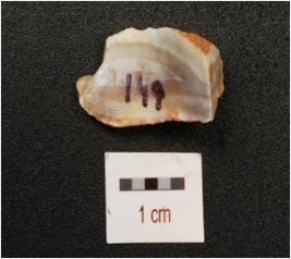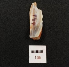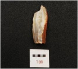 | Description / विवरण | Chert, blade on core with three blade scars and ripple marks on dorsal side, striking platform, partly broken along at distal end and cortex visible on surface. |