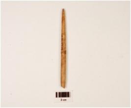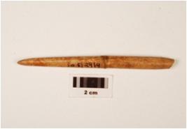 | Description / विवरण | A fragment of bone needle, pointed top, broken eye, round surface, mended from middle, polished with stains, off white in colour. |