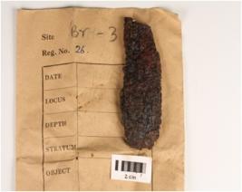| Description / विवरण | Fragment of iron knife, rough surface, chemically treated. |