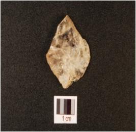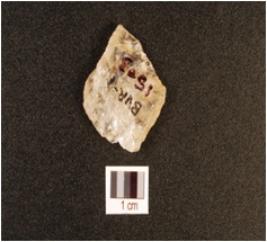 | Description / विवरण | A quartz scraper with use wear marks on working edge, prepared platform and flake scars on dorsal side. |