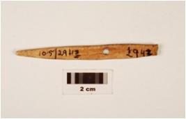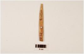 | Description / विवरण | A fragment of needle, with eye, pointed top, flat surface, groove inside, broken end, polished, brown in colour. |