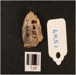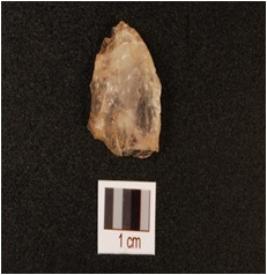 | Description / विवरण | A quartz scraper with use wear marks on working edge, prepared platform and flake scars on dorsal side. |