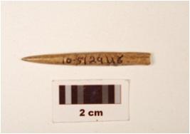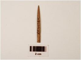 | Description / विवरण | A fragment of bone needle, pointed top, broken eye, round surface, mended from middle, polished, brown in colour. |