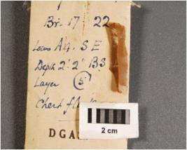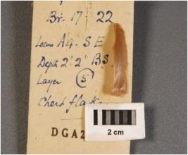 | Description / विवरण | Chert blade with a middle ridge on dorsal side, use wear marks on both the working edges, broken at both end. |