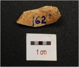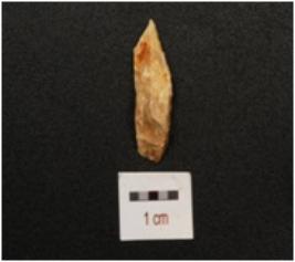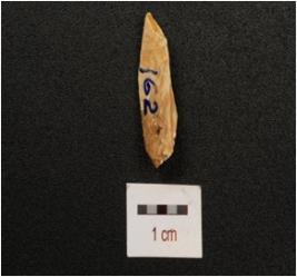| Description / विवरण | A chert blade with prominent mid ridge, triangular section and irregular retouches on one working edge. |