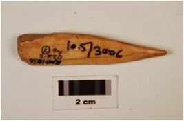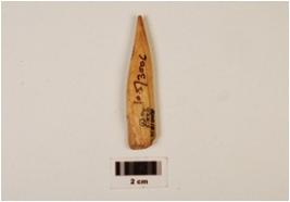 | Description / विवरण | A fragment of bone point, pointed top, broken from end, cracks on surface, broad bottom, polished, off white in colour, groove inside. |