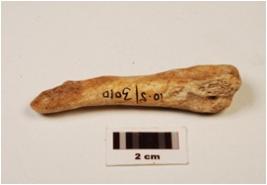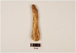 | Description / विवरण | A fragment of bone point, broken top, narrow from middle, round end, depression marks and stains are visible on surface, polished, off white in colour. |