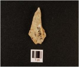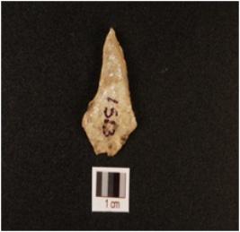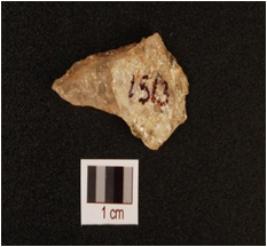 | Description / विवरण | A quartz scraper with smooth surface, use wear marks on working edge and bulb on ventral. |