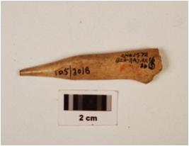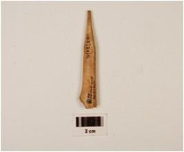 | Description / विवरण | A fragment of bone point, pointed top but chipped off, broken end, groove inside, flat surface, polished, off white in colour. |
