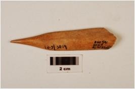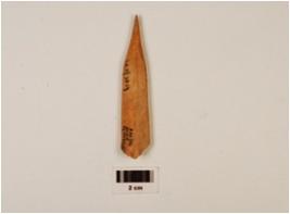 | Description / विवरण | A fragment of bone point, pointed top, broad bottom, broken end, groove inside, polished, off white in colour. |