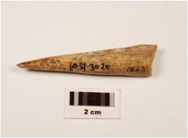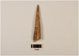 | Description / विवरण | A fragment of bone point, pointed top, broken end, triangular section, groove inside, cracks on surface, polished surface with stains. |