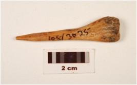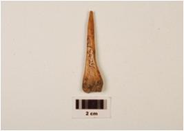 | Description / विवरण | A fragment of bone point, pointed top but broken, flat end, groove inside, round surface, polished, with stains, off white in colour. |