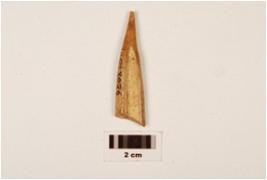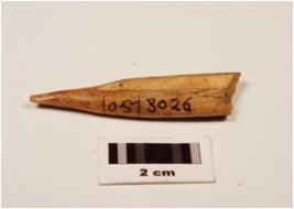 | Description / विवरण | Fragment of bone point, flat surface, pointed top, groove inside, broken end, polished, off white in colour. |