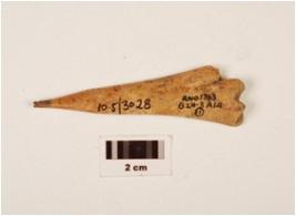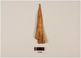 | Description / विवरण | A fragment of awl, pointed top, broad bottom, uneven base, groove inside, polished with stains, off white in colour. |