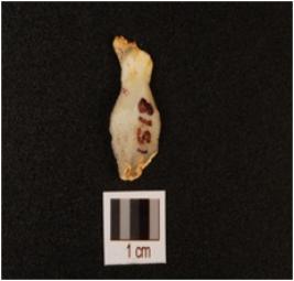| Description / विवरण | A chert blade with smooth surface, single ridge on dorsal and use wear marks on working edge. |