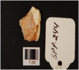 | Description / विवरण | Chert flake, irregular shape and use wear mark on the cutting edges. |