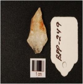 | Description / विवरण | Crystal flake, irregular shape, distal end pointed, proximal end broken and mark on the cutting edges. |