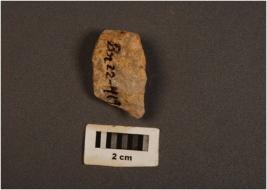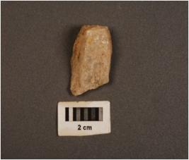 | Description / विवरण | Fragment of quartz core with three blade scars and cortex on surface. |