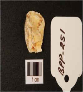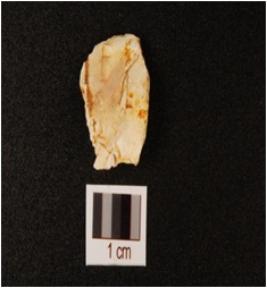| Description / विवरण | Chert flake, irregular shape, bulb of percussion on the ventral surface and use wear mark on the cutting edges. |
