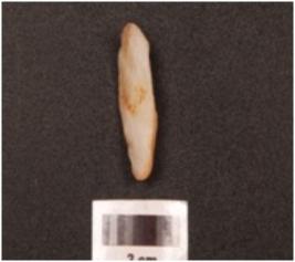 | Description / विवरण | A scrapper made on quartz with a prominent mid-ridge on the dorsal side, flake scars and irregular along the cutting edges, smooth on ventral side. |