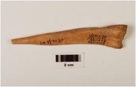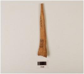 | Description / विवरण | A fragment of bone point, pointed top but broken, uneven base, groove inside, slightly flat surface, polished with stains, off white in colour. |