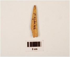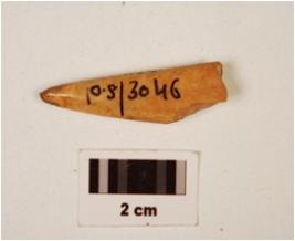 | Description / विवरण | A fragment of bone point, pointed top, broken end, broad bottom, groove inside, polished, off white in colour. |
