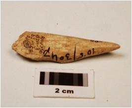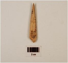 | Description / विवरण | A fragment of bone point, pointed top, flat surface, broken end, groove inside, polished, with stains off white in colour. |