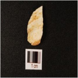 | Description / विवरण | Chert flake with point on the distal end, broken proximal end and use wear mark on the cutting edges. |