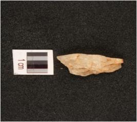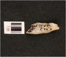 | Description / विवरण | A quartz flake with flake scars on surface and positive bulb. surface. |
