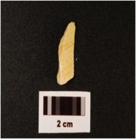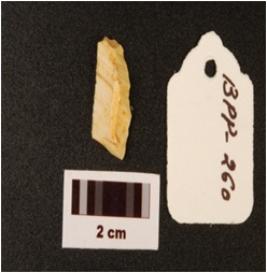 | Description / विवरण | Chert flake, prepared platform on the proximal end mark on the both cutting edges. |