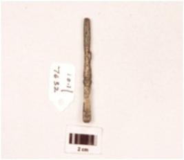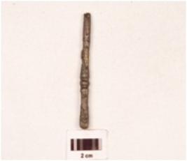 | Description / विवरण | A copper nail, intact top end, broken pointed end, square cross section, uneven surface, corroded surface. |
