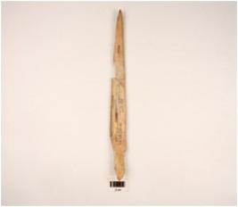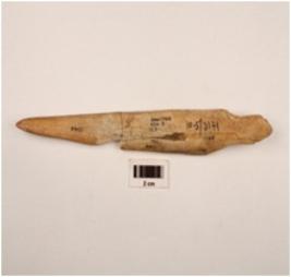 | Description / विवरण | An arrow head made on bone pointed at one evd and slightly damaged at one side with well polished and smooth surface. |