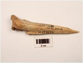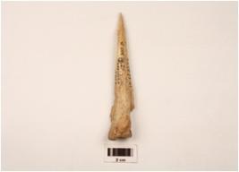 | Description / विवरण | A bone point with flat surface cracks visible, cream in colour, pointed one end, slightly broken other end, broad and broken surface, rectangular cross section. |
