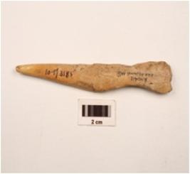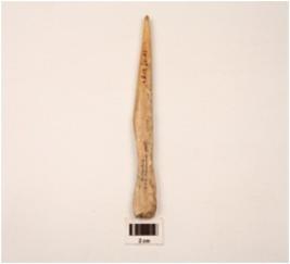 | Description / विवरण | A modified bone point polished distal and proximal ends party chipped off unevenly chipped surface visible hollow side. |