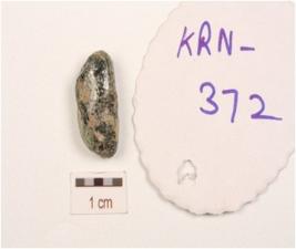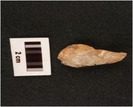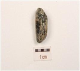 | Description / विवरण | Quartz flake, with a pointed end and irregular flaking on surface. |