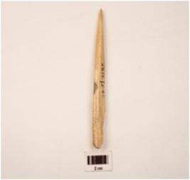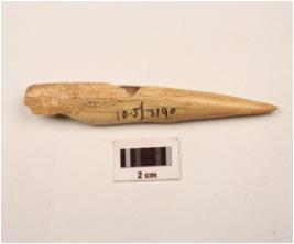 | Description / विवरण | A modified bone point polished sharp and intact proximal end chipped off distal end visible hollow side smooth surface. |