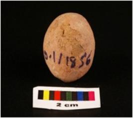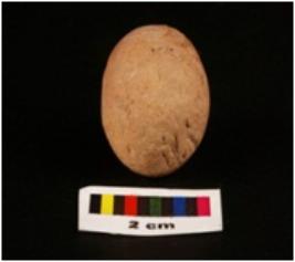 | Description / विवरण | Circular shaped terracotta sling ball, very rough surface, dull red in colour and slightly chipped off surface. |