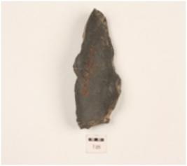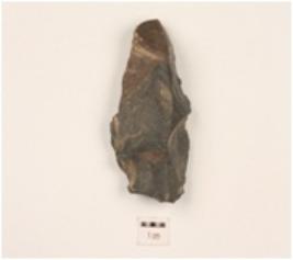 | Description / विवरण | A scraper made on chert, use-wear marks on working edge, flake scars on one side, prominent bulb on ventral side and triangular in section. |